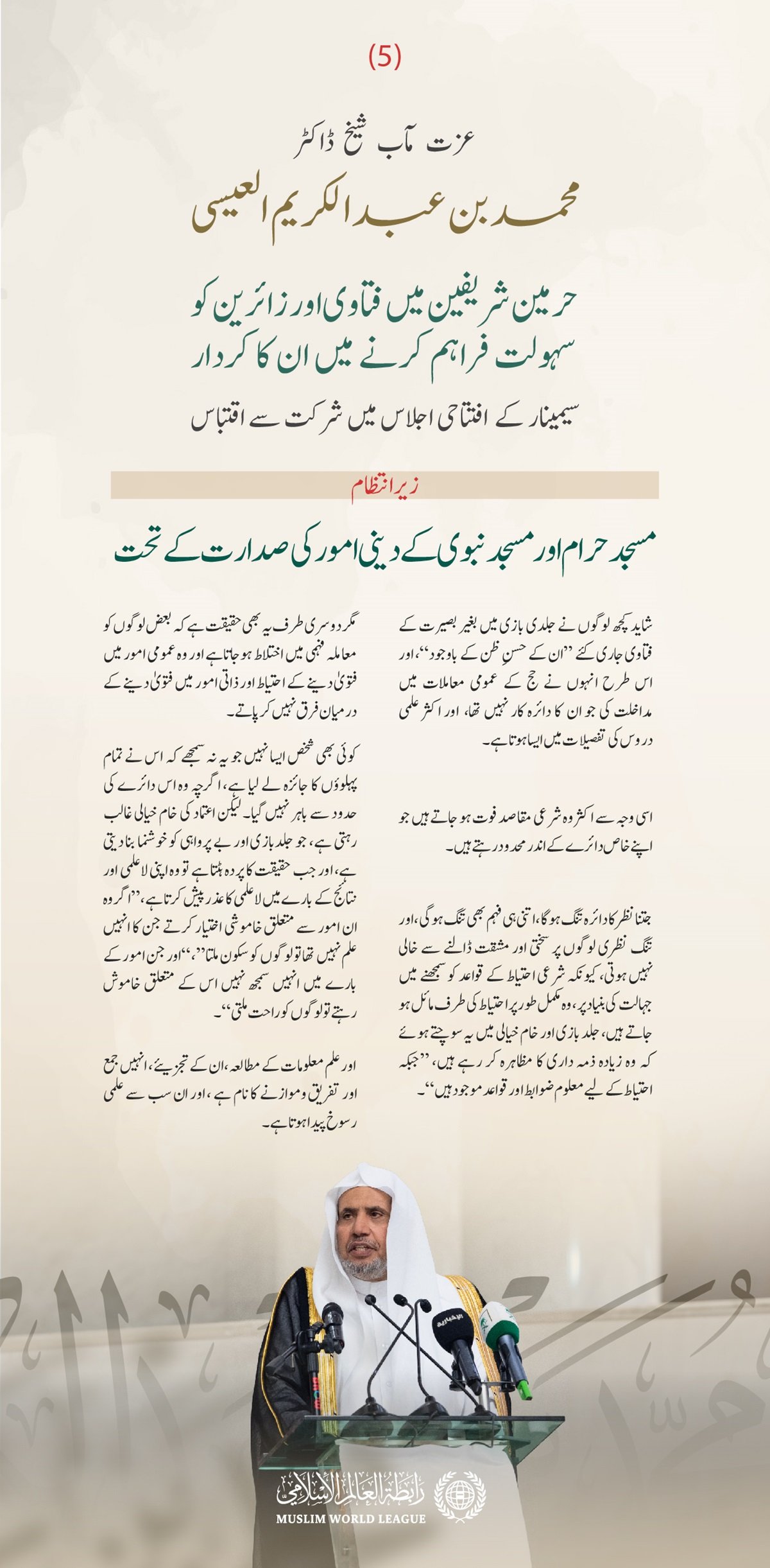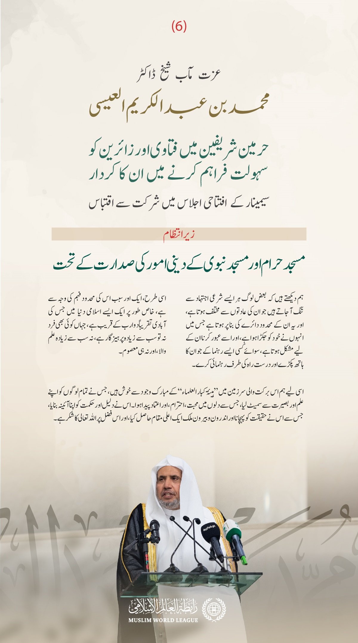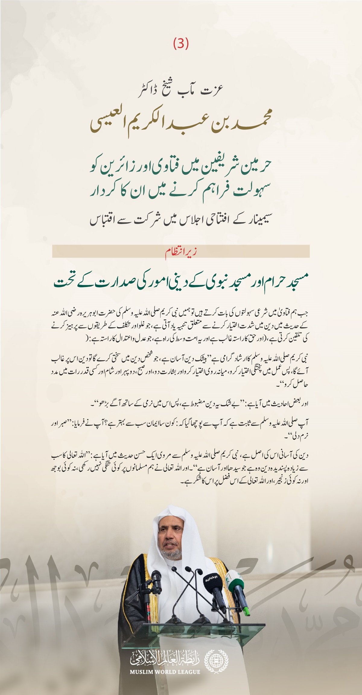 مسجد حرام اور مسجد نبوی کے دینی امور کے زیر اہتمام ”حرمین شریفین میں فتاوی اور زائرین کو سہولت فراہم کرنے میں ان کے کردار“ کے عنوان سے منعقدہ سیمینار کے افتتاحی اجلاس میں سیکرٹری جنرل رابطہ اور چیئرمین مسلم علماء کونسل، عزت مآب شیخ ڈاکٹر محمد العیسی کے خطاب سے اقتباس: